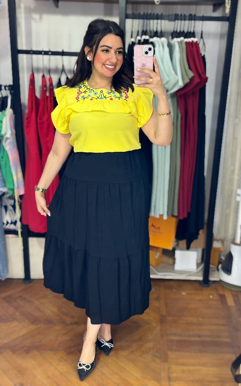 Brighten up your day with this sweet and stylish ruffled blouse. Featuring colorful floral embroidery around the neckline and soft ruffle detailing across the chest and sleeves, it adds a playful, feminine touch to any outfit. Made from lightweight, breathable fabric—perfect for pairing with jeans or skirts for a cheerful, everyday look.
