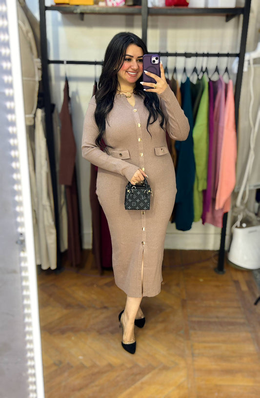 Basic Long Knit Dress with Gold Buttons