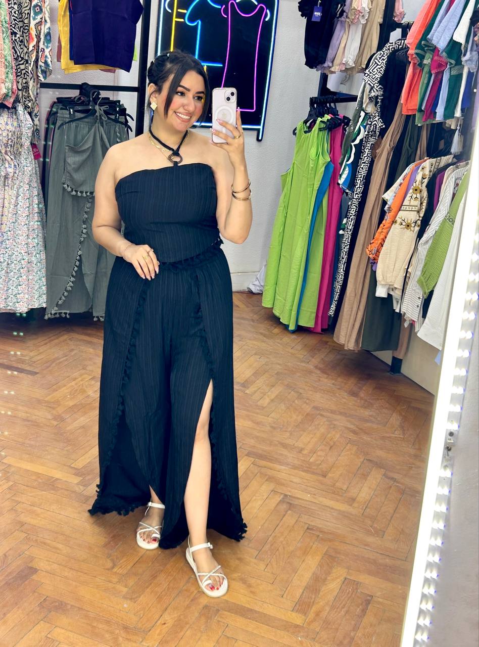 Stay cool and effortlessly chic in our linen two-piece set, designed for comfort and style in every step. This matching outfit features a strapless bandeau top paired with wide-leg pants that showcase dramatic side slits, finished with soft tassel trim for a playful, flowy look.