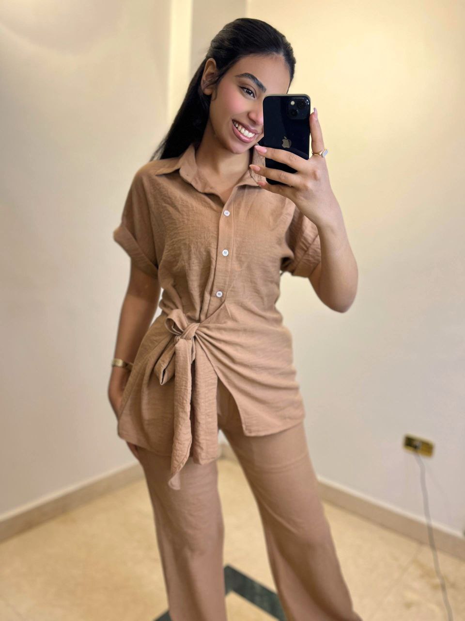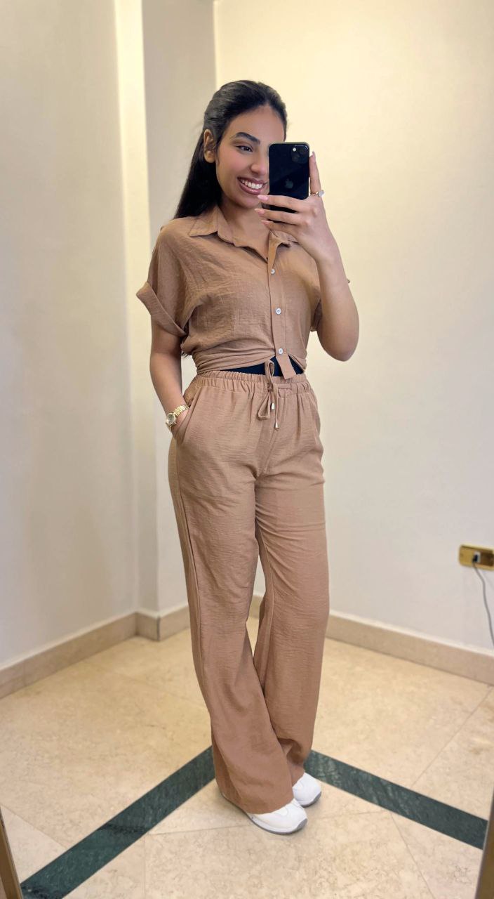 Stylish two-piece set featuring a relaxed button-up shirt and matching wide-leg pants. The shirt is designed with a classic collar, short sleeves, and a front tie detail that adds a modern and flattering touch to the silhouette. The matching pants offer a comfortable, easy fit, making the set perfect for everyday wear, casual outings, or travel. Crafted from lightweight fabric for a breezy and effortless look, this set can be styled with sandals or sneakers for a chic, laid-back outfit.