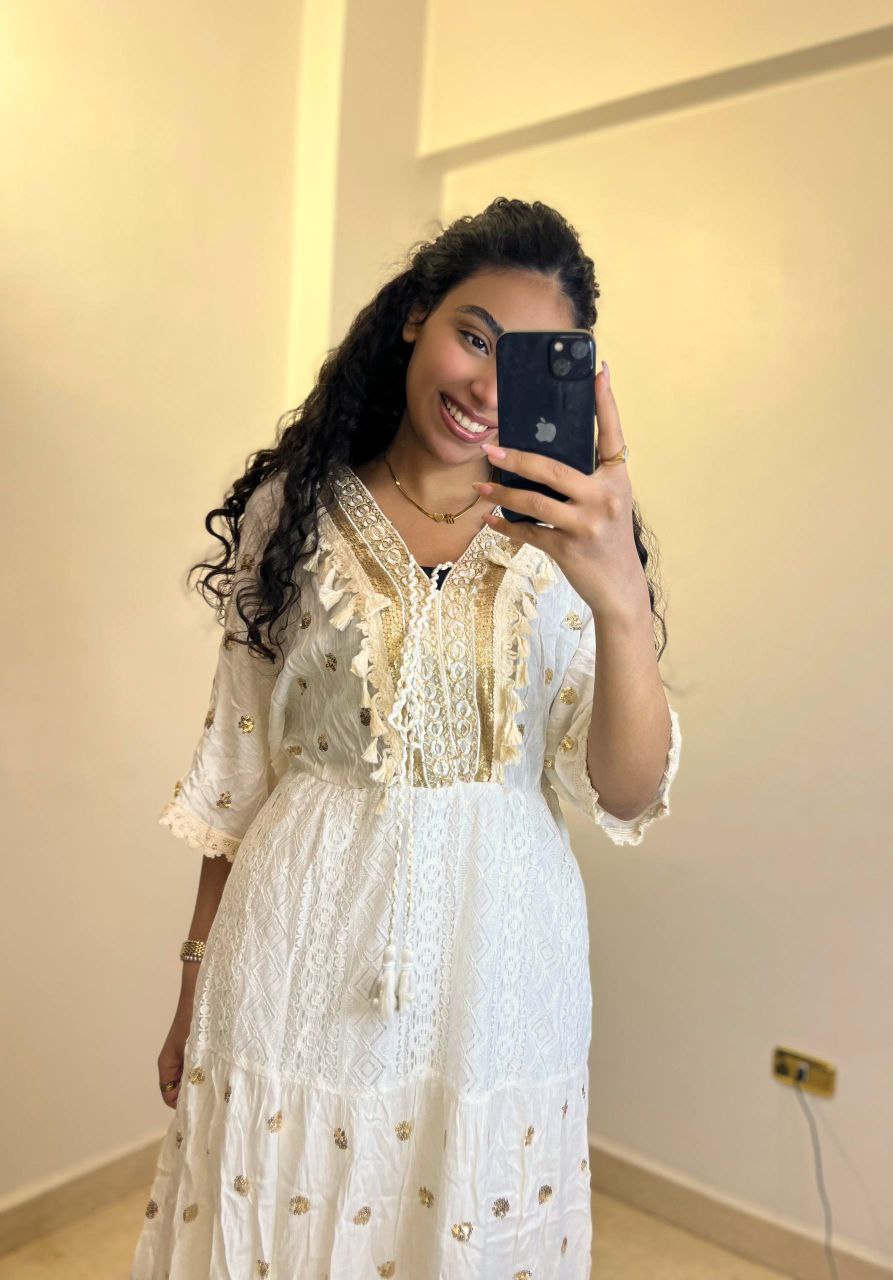 Graceful maxi dress featuring delicate embroidery and elegant lace accents that add texture and charm to the design. The dress is designed with a flattering high waist and a relaxed, flowing silhouette for all-day comfort. It features a beautifully detailed neckline with tassel ties and subtle fringe details, along with three-quarter sleeves for a refined touch. Made from lightweight, breathable fabric, this dress is perfect for casual outings, vacations, and daytime gatherings. Style it with sandals or minimal accessories for an effortlessly elegant look.
